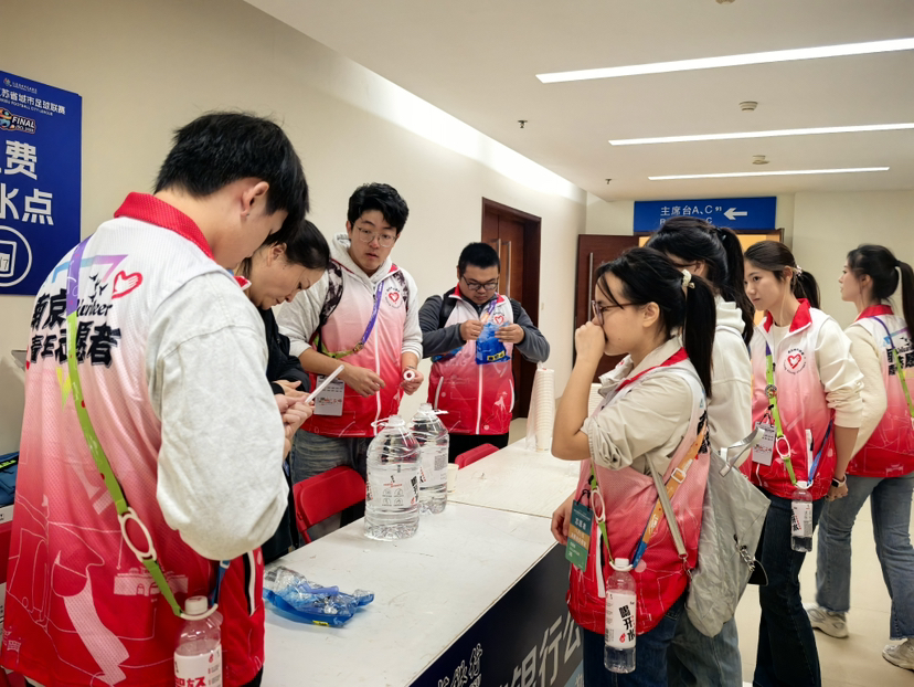 来自南京信息工程大学教师教育学院的大四学生查李思,已是第二次参与“苏超”志愿服务。“从常规赛到总决赛,不仅赛事规格升级,志愿服务体系也越来越完善。”查李思告诉记者,她此次值守奥体中心主体育场四层观众休息区倒水点,这个紧邻卫生间和食品售卖点的高频停留区域,让她的服务时刻“在线”。从上午10点参加专项培训,到领取助威棒、饮用水等物资,再到提前1小时完成300余个水杯的装填摆放,她和搭档全程无缝衔接。比赛期间,她们累计补充20L装饮用水6桶,装杯服务近300次,赛后回收剩余助威棒120根,分类清理垃圾3袋,用细致工作确保“断水”“缺杯”零发生。让她尤为触动的是两个暖心瞬间:一位老奶奶借水服药后的真诚致谢,五岁小男孩接过水杯时纯粹的笑容,“这些瞬间让站了一整天的疲惫烟消云散,也让我读懂了志愿服务‘被需要’的价值。”