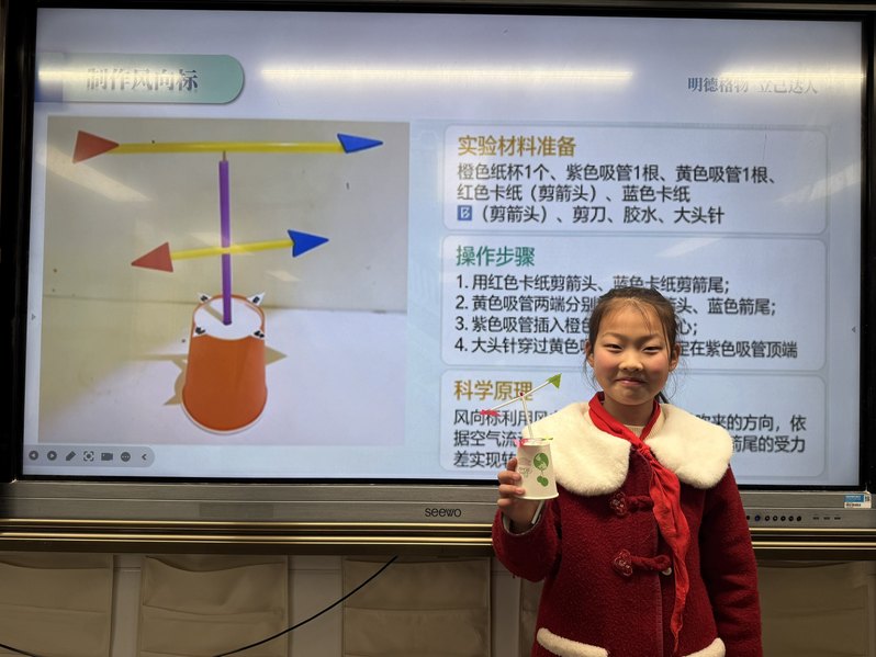 为确保课堂质量,学院提前精心筹备。在张海老师指导下,主讲人结合小学生认知特点,围绕天气现象形成、气象观测仪器等内容打磨教案、反复试讲,并融入竺可桢的事迹,实现知识传授与价值引领同频共振。课堂上,趣味提问激发学生兴趣,科普视频直观呈现大气运动原理。手工制作风向标环节气氛热烈,同学们分组协作完成作品并现场实操判断风向,在玩中学、学中悟,感受气象与生活的紧密联系。