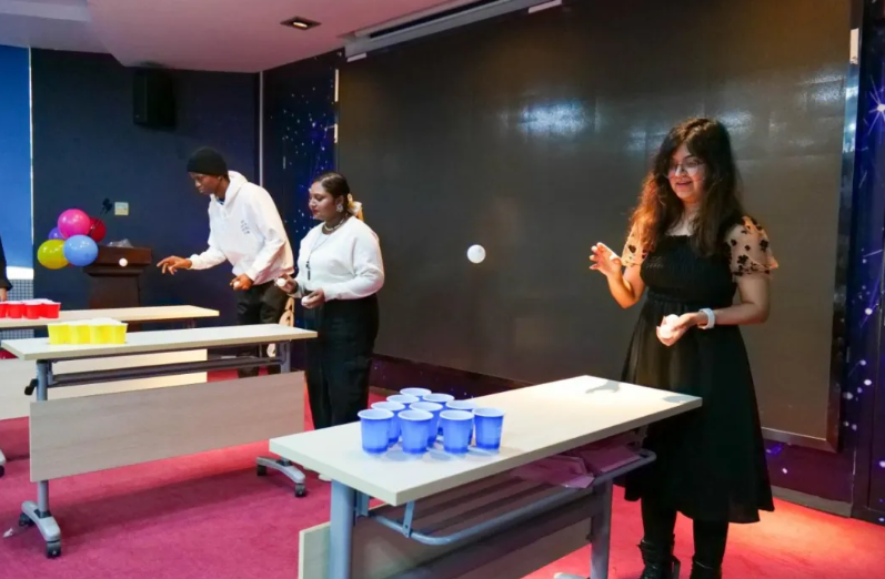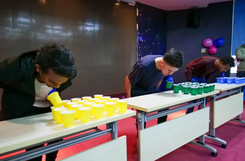 The excitement continued to soar with the arrival of the Bouncing Cup challenge. The volunteers arranged cups in a triangular shape. With three balls at their disposal, participants took turns skillfully bouncing them on the table, aiming to land them into the waiting cups.